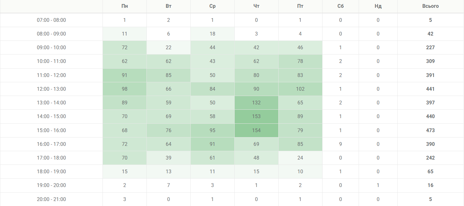 Перегляньте завантаження операторів за допомогою спеціального звіту за годинами та днями. Може статися так, що на час, коли у вас пікова кількість дзвінків (запуск реклами, акція чи вечірній час), на зміні просто не вистачає операторів і потенційним покупцям доводиться чекати. І навпаки — занадто багато персоналу, коли заявок не так вже й багато.