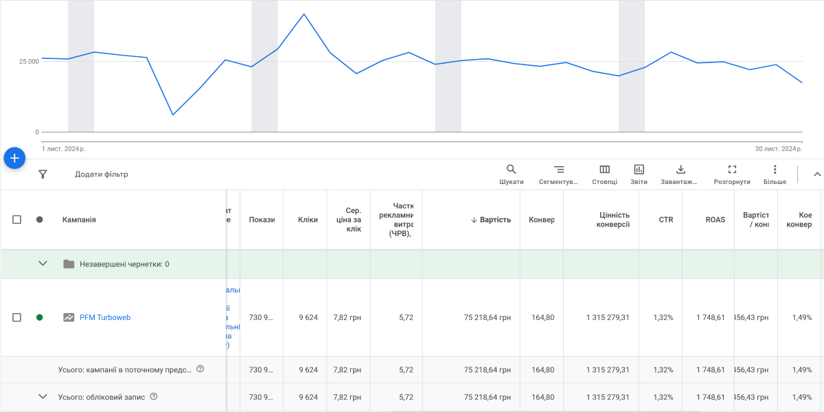 На початку вересня ми запустили Performance Max у кабінеті клієнта. Станом на 1 - 31 листопада клієнт отримав ось такі результати: